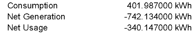 Eyeballing the chart, it’s clear that we’ve imported more than we’ve exported, so we have definitely used more energy than our solar panels provided. If we add up the Net Usage for 20231, it’s 904 kW·h, which is far too low to be our actual consumption. That must be just the net amount of electrical energy PG&E provided.