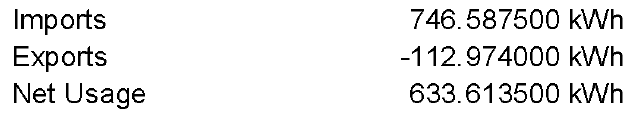 If we total up the Import for 20231, it’s 5730 kW·h, or about at the top of our estimated range. However, we Exported a lot too; in fact, the Net Usage figures are exactly the sum of Import and Export.