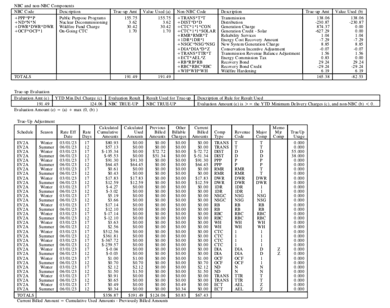 So we know how much the rate actually went up, and we know how much energy we used on net. To figure out how much we should have been charged, we would need to know which rates applied to that net usage. And if we generate surplus off-peak and consume more on-peak, do we pay the difference? To answer questions like this, we something that PG&E calls the Detail of Bill8, and the internet seems to be calling the Black and White Bill9. It looks like this: